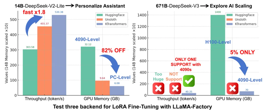 针对模型微调的核心需求,KTransformers与LLaMA-Factory深度集成,支持LoRA等轻量级微调方法,仅占用约41GB显存+2T内存,就能实现46.55 token/s的微调吞吐量。传统上,LoRA微调千亿模型成本高达数百万,而趋境的异构微调能力将资源需求降低到单个消费级GPU(如 RTX 4090)起,这使得高校、中小型实验室、初创公司甚至个人开发者都有机会参与进来。该方案在DeepSeek-14B模型上展现了超过传统方案1.8倍的吞吐、显存占用降低82%,是消费级显卡上微调超大参数MoE模型的唯一可行方案。