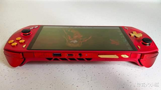 外观上,F1pro还是熟悉的掌机id设计,以标准游戏手柄为基础布局,做成了矩形横版式的构造。机身体积并不大,单手、双手握持,操作没有违和感,双手横握的情况下,左右对称,点按操作对应的导航键和技能键,非常顺手。机身厚度达到22.6mm,重量599克,虽然小,但又厚又重,十分扎实。明日香定制版的机身以红色调为主,丝印了丰富的浮雕在外壳上,加上金色的按键组合,很有几分老人机的观感。